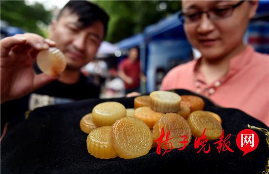 揚子晚報網9月11日訊(記者吳勝)2015年9月11日,南京莫愁湖公園迎來首屆奇石展,展覽匯聚全國各地具有特色的奇石文化品種。 現場市民還能有幸“品嚐”到一款精心雕琢的玉石“月餅”,俗稱金絲玉。 玉石表面色澤金黃,立牆為乳黃色,花紋玲瓏清晰,油潤滋膩,這些“月餅”的造型和我們中秋節吃的月餅一樣,惟妙惟肖,讓人嘆為觀止。