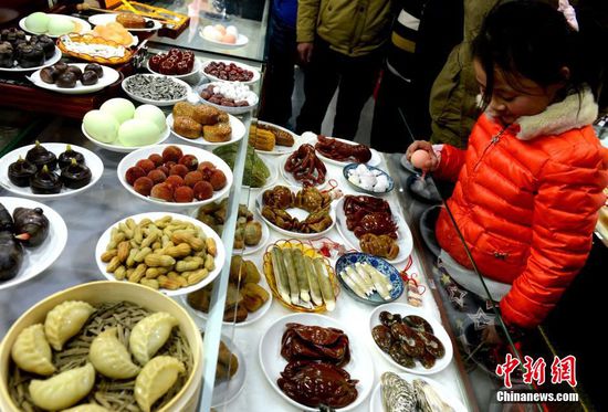 猴年春节将至,2月6日,福州南后街展出近70道“寿山石年夜饭菜肴”,引民众争睹。中新社记者 刘可耕 摄