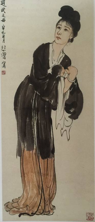 天公嫉才,悲鸿先生在五十八岁时,溘然长逝,安葬于八宝山革命公墓。他的作品,失于离乱,焚于兵燹,流于民间,一如散珠零玉,约占大半。留下的幸多精心力作,陈列于北京新街口徐悲鸿纪念馆。每次凭吊遗像,瞻仰遗作,我不禁悲从中来。追溯先生自少及殁,未曾有一日安享清福,怅惋贤哲,惟馀一哭。然则先生之勇毅不屈、万难不惧,对艺术竭诚尽忠、死而后已的精神,却永远光照人间,泽被万世。倘若先生有墓志铭,我相信,上面应当是: 尊德性、崇文学、致广大、尽精微、极高明、道中庸。