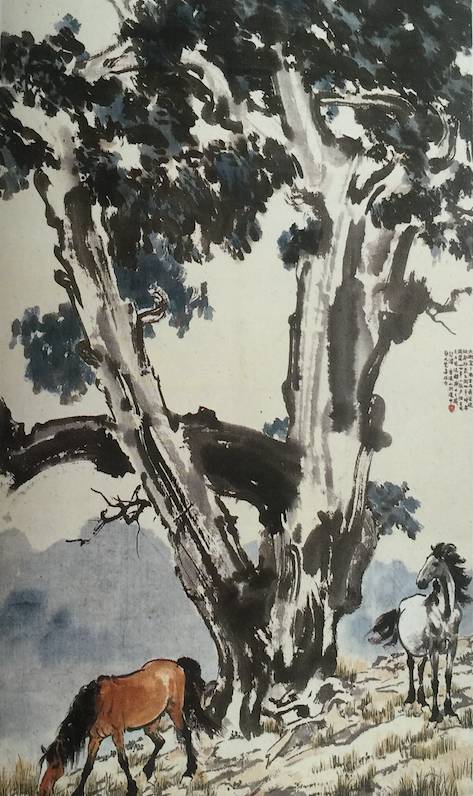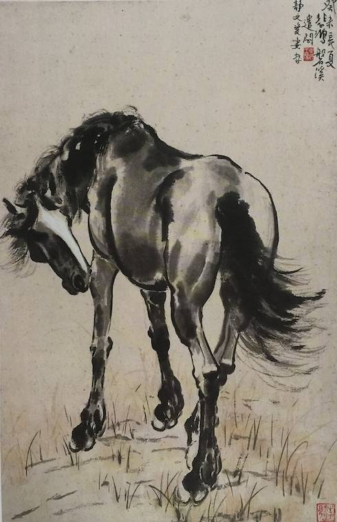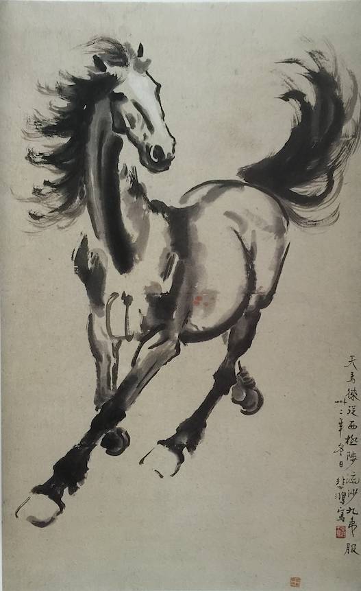徐悲鸿的艺术,质而言之,概而言之,曰博大、曰沉雄、曰典雅,在他的画中决无取悦于人的市井气、取媚于人的市侩气,没有浮溢于形色的脂粉气、透露于笔墨的铜臭气,它们以炜哗的风采征服‘了世界。在悲鸿先生的画前,一股浩然壮阔之气,一股清新俊逸之气,直迫眉宇,只感飘风爽发,令人有遗世独立之概。在生活中豪放和潇洒是装不出来的,艺术家的作品亦然;在作品中透露的人格,比文字的描述或奖饰真实百倍,真是洞若观火。即以画马而言,徐悲鸿的马,可谓古今中外一人。以十九岁之少年,高剑父称之曰“虽古之韩干,无以过也”,信不为妄。马的嘶鸣伴着落日大旗,马的霜蹄踏着千古沙场,清俊、风发的身段,壮烈无畏的神采,是“真堪托死生,万里可横行”的兽中豪杰。我看过几乎所有的画马高手,谁能如悲鸿先生那样入木三分地刻划其形神、表现其品格。于是我想到“缘物寄情”原不是一句空话,画上事物的品性原就受画家的品性的光照,无论回光,无论折射,都是艺术家性灵之所在。徐悲鸿的奔马,是对光明的追逐,每一披览,往往使人感而出涕,回顾先生多灾多难的少年,坎坷多舛的命途,而那皈依真理、百折不回的毅力,正如百战山河、苦觅生刍、追风万里的战马,每一次的奔驰,每一次的腾骧,都夹带着时代的烟尘风雨,其悲怆壮烈,使人对徐先生的人生肃然起敬。