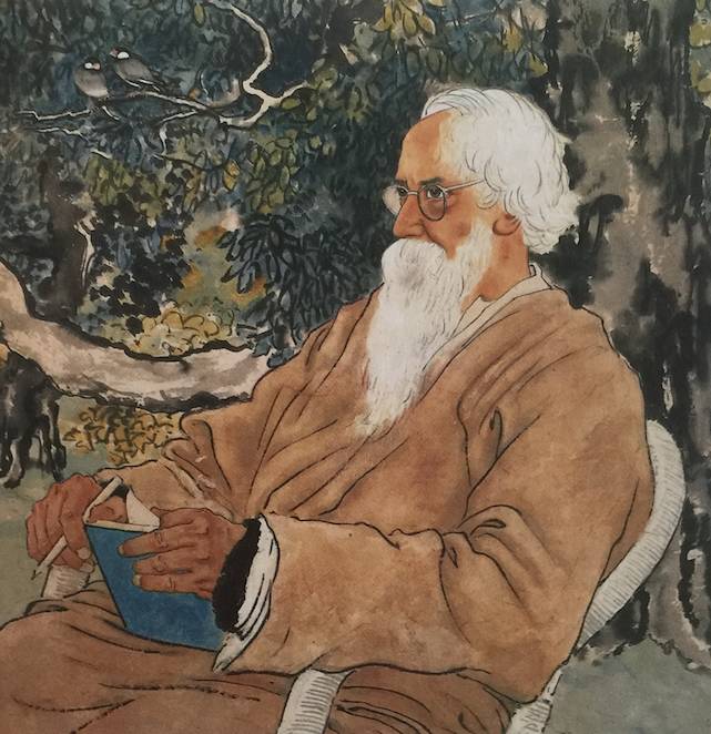 徐悲鸿的另一张诗人肖像《泰戈尔》,则将他自己的艺术理想推向一个更加诗化的境界。皓如积雪的银须,澄若深潭的双眸,使这位哲人、诗圣既庄严而恻隐的神韵,充盈于芳草丛林,嘤嘤其鸣的小鸟伴和着诗人的沉吟。衣纹疏朗挺秀,背景墨渖淋漓,形与神、情与景、实与意是何等谐调,何等冲和。徐悲鸿曾在论艺之写实、写意时指出,对历代大师而言,不可绝对划分其归属写实或写意。罗丹写实而具魂,夏凡写意而达理。徐悲鸿崇尚苟子“苟日新、又日新”的名言,他说:“彼惟以写实为方法,其智能日启,艺日新,愿日宏,志日大,沛然浩然。”原来,悲鸿先生的“大和”之境也就是“造化”与“心源”,客观与主观、微观与宏观的高度统一。只有这样,才能有“浩然”之气,这是沛乎苍冥之气,是“在地为河岳,在天为日星”之气。一个艺术家只有为这浩然之气所激发,才会有真正伟大的艺术。