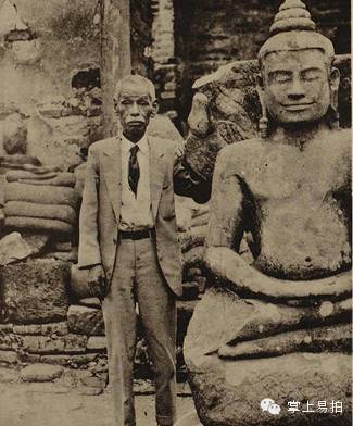山中定次郎在山西天龙山石窟与佛像的合影