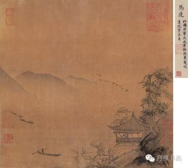 马远的山并不以雄伟见长,而是以清新取胜。尤其是瘦削的远峰,宛如水石盆景,灵动轻盈。马远善于大胆取舍剪裁,描绘山之一角水之一涯的局部,画面上留出大幅空白以突出景观。从他的画中,能最直观地感受到中国画中留白的妙趣。