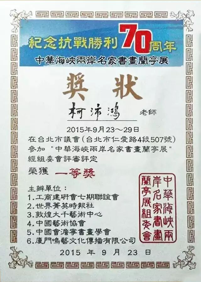 2015年韩中日美术协力祭国画书法作品荣获最高大奖,同年荣获抗日战争胜利70纪念书画展一等奖。